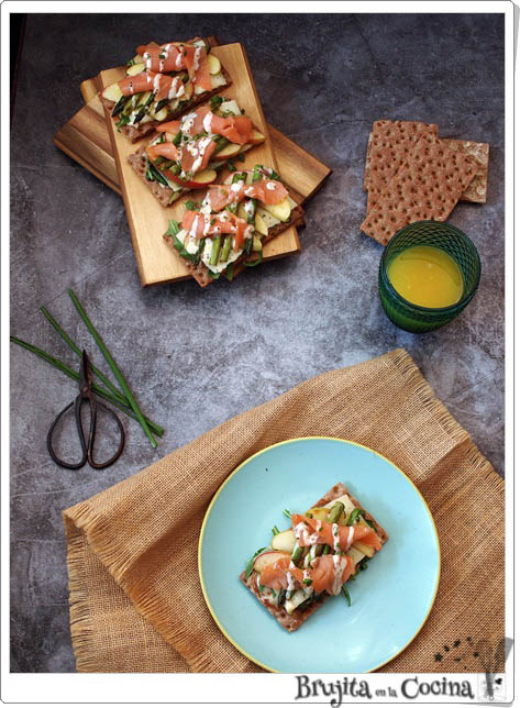 Para el montaje, sobre una tosta untamos un poco de la salsa, después ponemos rúcula, media loncha de queso y 3 gajos de manzana, después trigueros, unos 4 y terminamos con unas lonchas de salmón, adornamos con un poco mas de salsa y cebollino picado