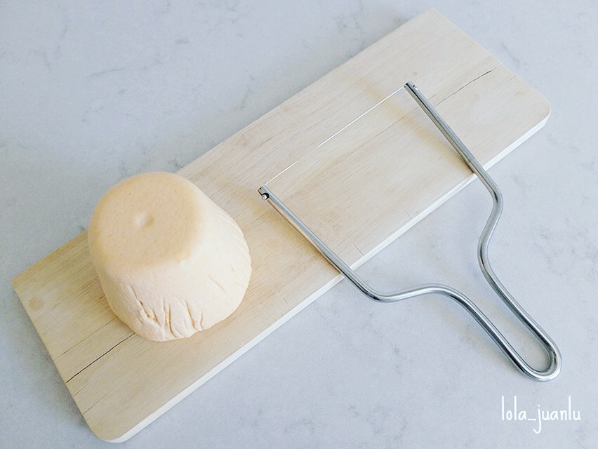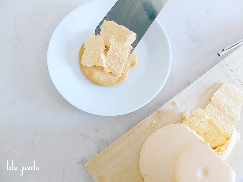 Con ayuda de una lira cortamos el queso en láminas finas y comenzamos el montaje, de manera que cogemos una galleta y la cubrimos con las láminas de queso.