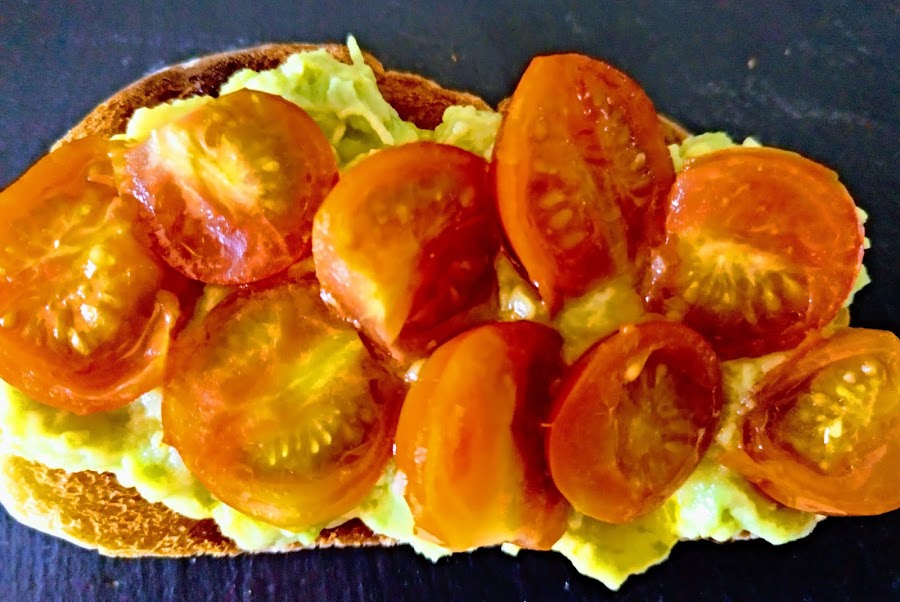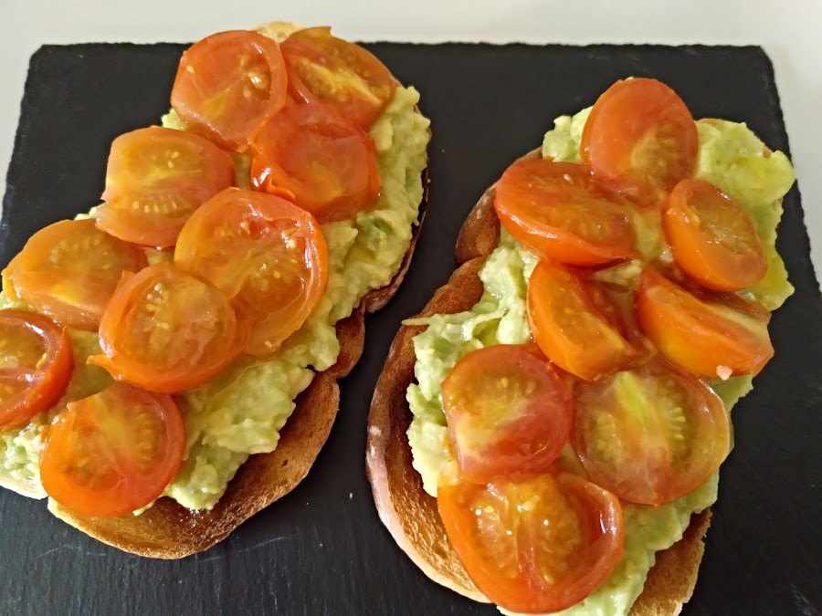 Extendemos el aguacate sobre el pan tostado. Colocamos por arriba los tomates y ... a disfrutar.
