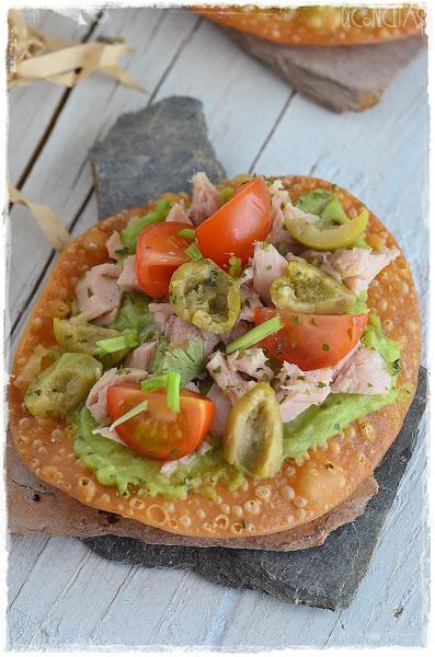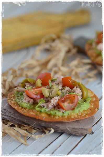 Disponemos encima la oblea, el guacamole, atún, tomates cherry, aceitunas y ajetes tiernos. Queda perfecta para comer al momento evitando que la oblea de ablande.
