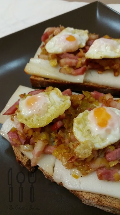 Para montar nuestra deliciosa tosta, empezaremos con el pan, después el queso, encima el bacon y el puerro (mejor que esté caliente para derretir un poco el queso) y por último los huevos de codorniz.