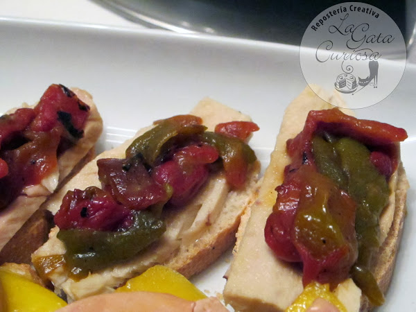 Tostamos el pan, colocamos sobre el pan un trozo de bonito y sobre este un poco de pimiento confitado.