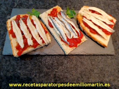 En cada tosta o rebanada colocamos los pimientos caramelizados y encima de estos los boquerones en vinagre.