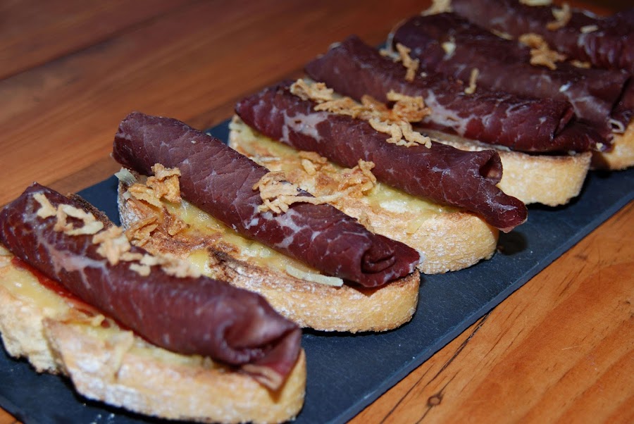 Cortar el membrillo en rectángulos y formar un rollito de cecina con el membrillo en su interior. Colocar el rollito sobre el pan y espolvorear por encima la cebolla crujiente.