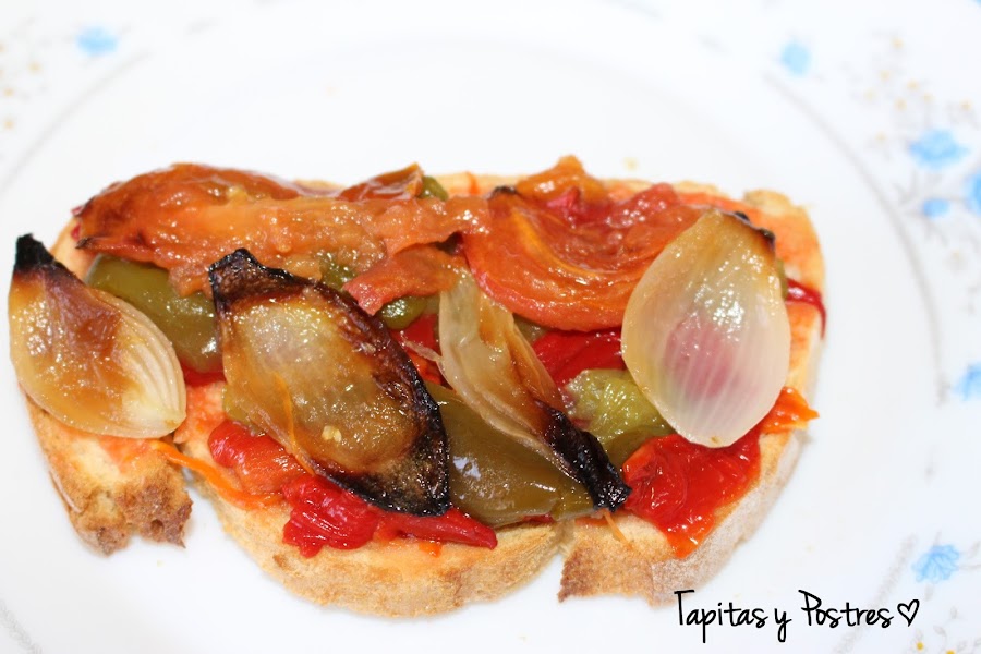Pero ya sabéis que yo soy la reina del tuneo, asi que he fusionado un plato catalán con uno andaluz, porque a esta ensalada tan rica de verduras le he añadido un fondo de salmorejo y la he puesto sobre pan lo que no ha hecho más que enriquecer la receta.
