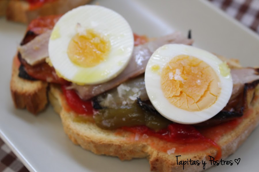 Tostamos las rebanadas de pan en el horno, unos minutos, hasta que estén doradas pero sin pasarse. Las untamos con medio ajo y ponemos un lecho de porra. Encima colocamos tiras de nuestras verduras asadas (pimientos, berenjenas, cebolla y tomate), aliñamos con un hilo de aceite de oliva y con escamas de sal y rematamos con unas migas de ventresca de bonito y un par de rodajas de huevo cocido.