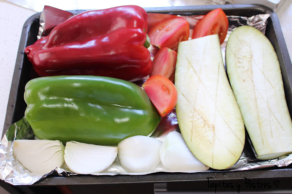 Precalentamos el horno a 180º. En una fuente de horno forrada con papel aluminio ponemos la berenjena partida por la mitad y con unos cortes transversales en la carne (pata poder quitar la carne con facilidad), el tomate y la cebolla en cuartos y los dos pimientos enteros. Regamos con un hilo de aceite de oliva y horneamos unos 45 minutos. Pasado ese tiempo veremos que la cebolla, el tomate y la berenjena están asados, los sacamos con cuidado y los reservamos en un plato. Mantenemos los pimientos unos 15 o 20 minutos más. Al acabar, liamos los pimientos en papel aluminio para que "suden" y asi poder pelarlos bien después.