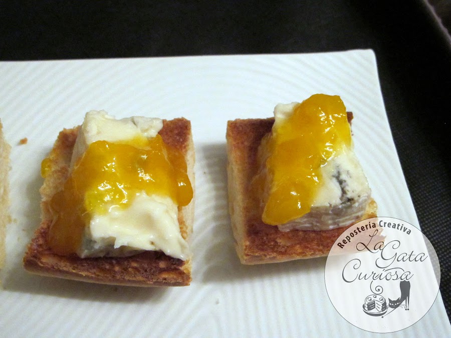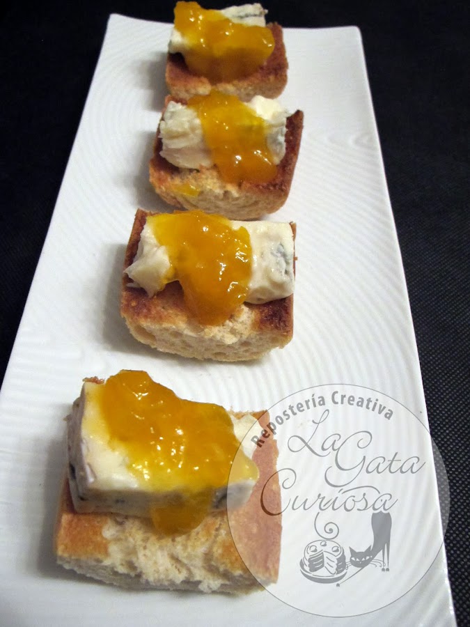 Tostamos el pan y lo pasamos a dos fuentes de servir, en unos trozos de pan colocamos el queso gorgonzola y distribuimos encima una cucharadita de mermelada de mango y ya tendremos lista una de las tostas.