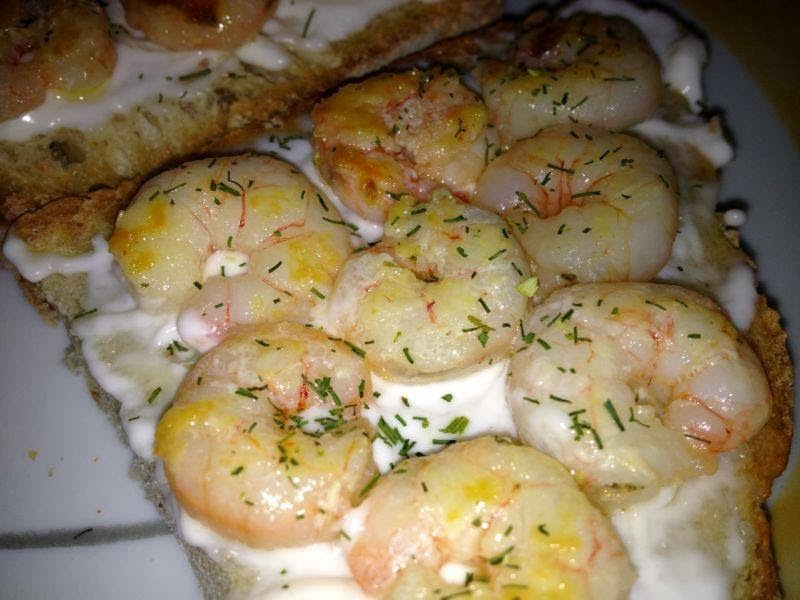 Poner en una sartén con un poco de aceite las gambas a saltear. Mientras tanto, tostar el pan y, cuando esté, untar la ajonesa?, la cuál no debe quedar muy espesa. Colocar las gambas encima y echar un poquito de eneldo.