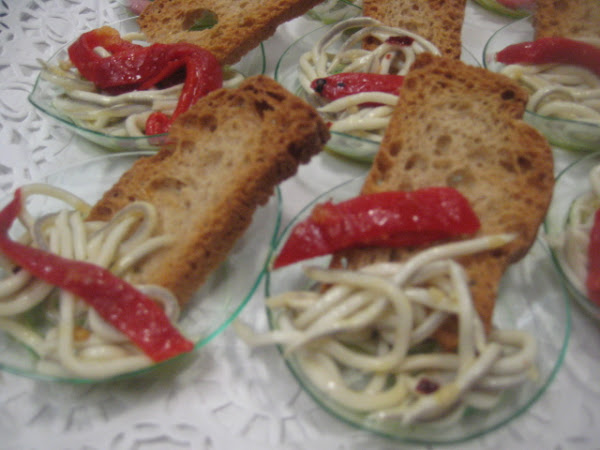Preparación: En una sartén poner el aceite y añadir el ajo y la guindilla, teniendo a fuego suave para que se vaya haciendo pero no se queme. Cuando esté calentito añadir las angulas sucedáneas y saltear unos momentos. Colocar sobre tostadas de pan y poner encima una tira de pimiento rojo asado (casero) o una tira de pimiento del piquillo. Otra forma de presentar este plato es poner en una cazuela de barro las angulas sucedáneas bien calientes y luego el pimiento en otro recipiente, colocar el lado tostaditas de pan y cada uno se puede preparar su tosta o comérselo como desee.