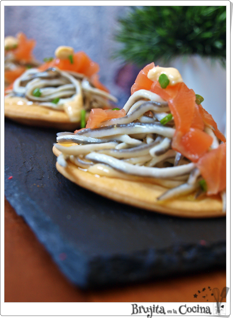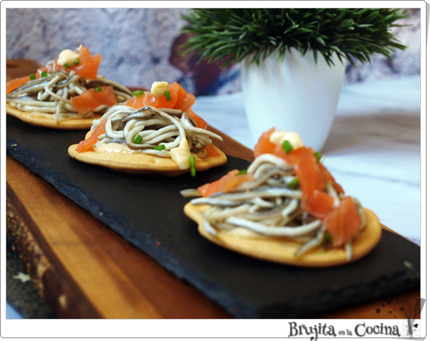 Untamos la tosta con el alioli ahumado por encima pones unas angulas sucedáneas y salmón, ponemos un poquito más de alioli y espolvoreamos cebollino picado.