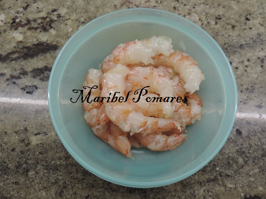 Mientras pelar los gambones y colocar en un tazón.