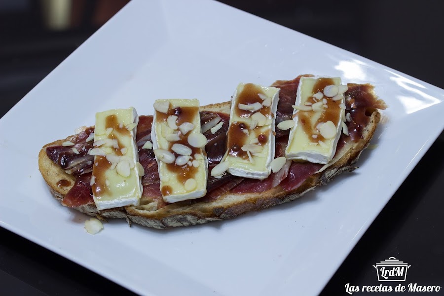Colocamos en primer lugar las lonchas de jamón ibérico. Cortamos unos trozos de queso brie y los ponemos encima.