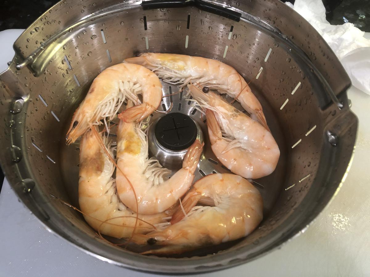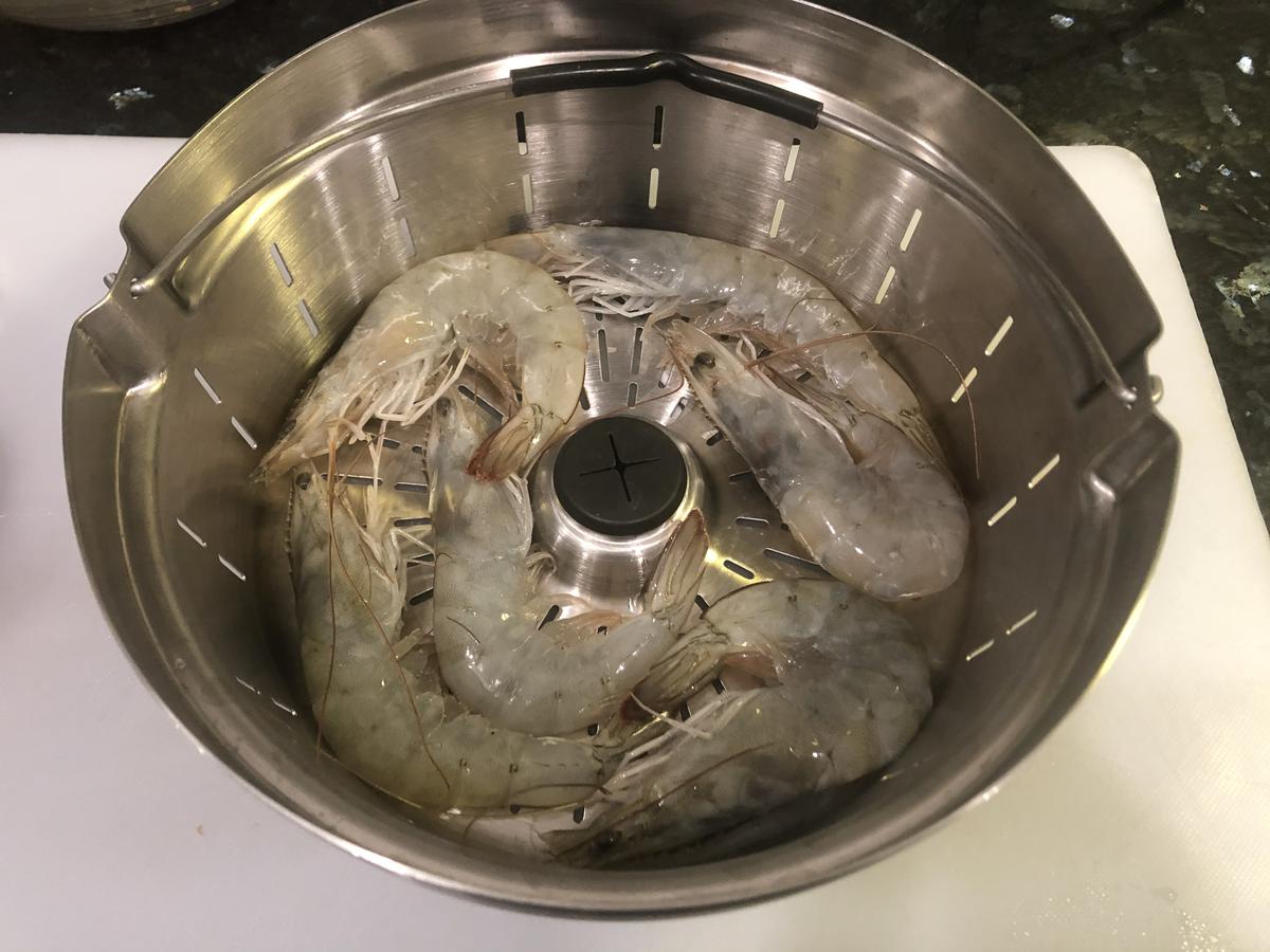 2. Sin tirar el agua del bol, colocamos los langostinos en el cestillo y programamos vapor, 100º, 4 minutos con el tapón puesto en la posición “maxi. vapor”. En ese tiempo, si el agua ya está hirviendo y los langostinos no son enormes, se cocerán bien. Si hacemos más cantidad, podemos hacerlo en la vaporera externa. En ese caso, programaremos 5 minutos y al terminar nos aseguraremos que estén bien hechos.