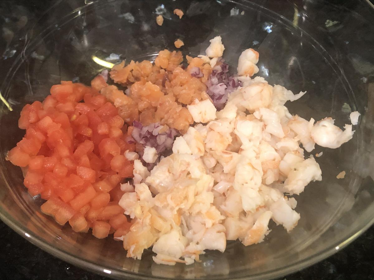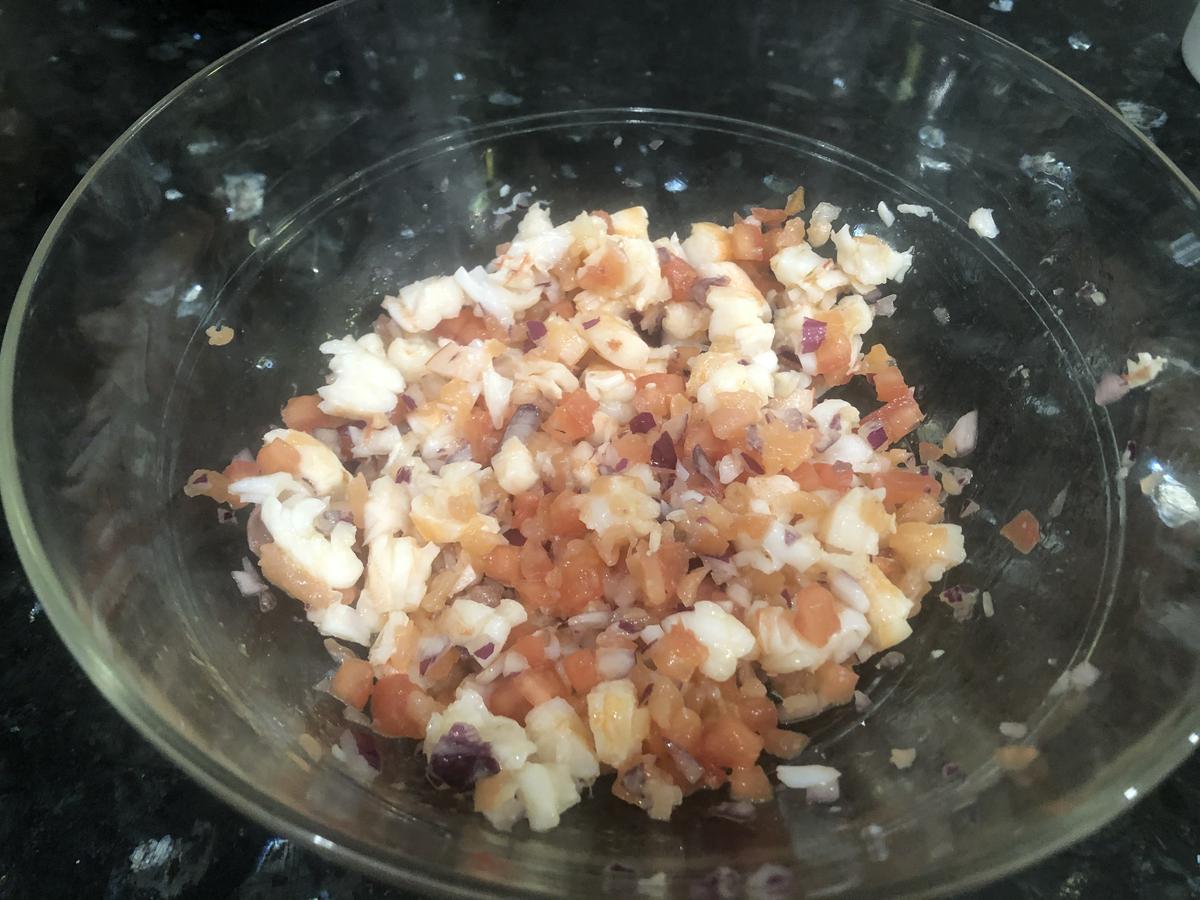 5. Mezclamos todo, el tomate, la cebolla, el salmón y los langostinos. Condimentamos al gusto con sal y pimienta y un chorrito de aceite. Reservamos mientras preparamos la salsa.