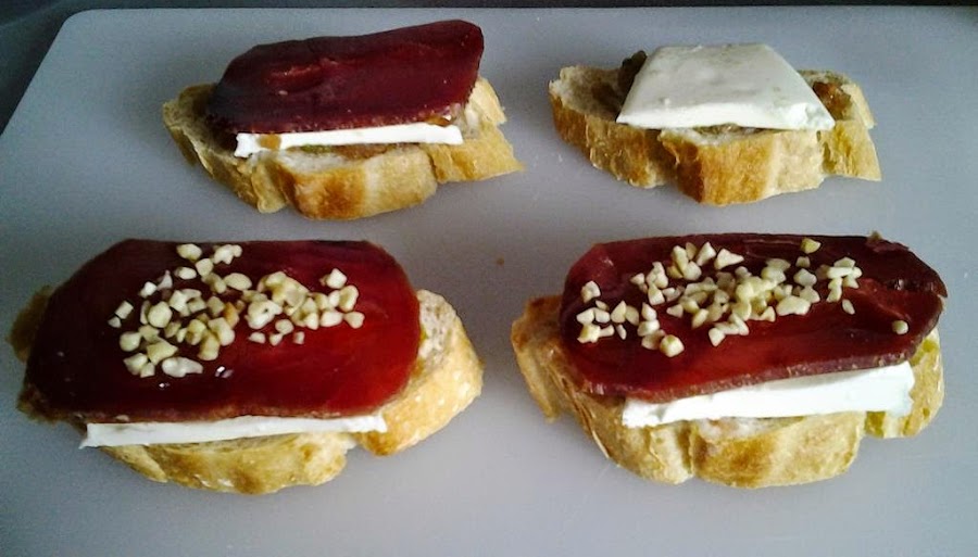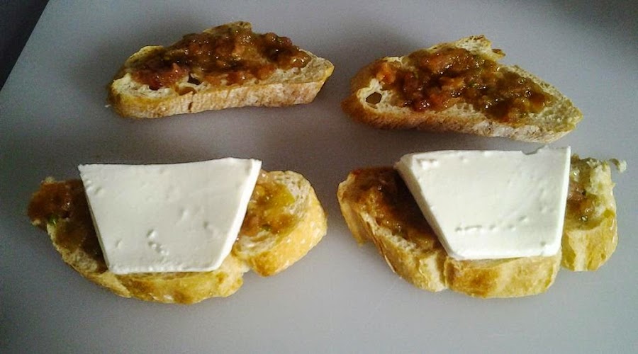Untamos el tomate en el pan, colocamos encima el queso, encima las lonchas de mojama.