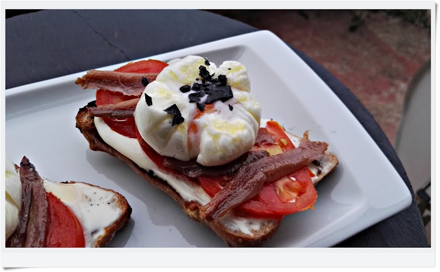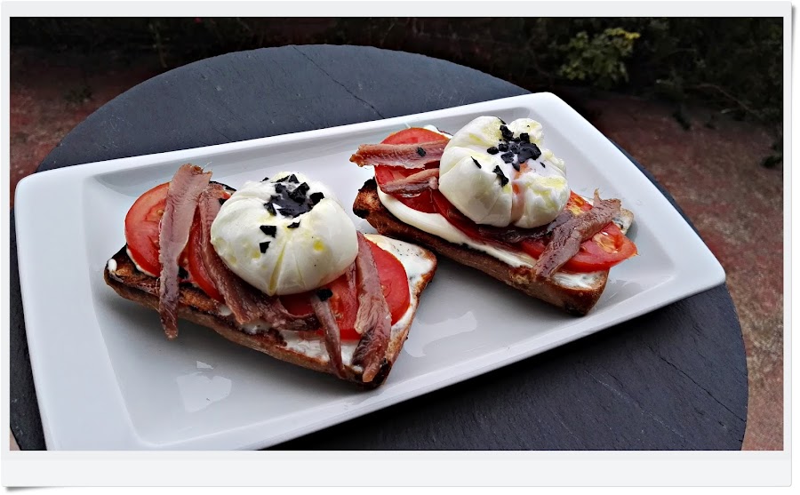 Untamos nuestros panes con crema de queso, le ponemos un chorrito de miel a cada una y encima el tomate, colocamos las anchoas y por ultimo con mucho cuidado los huevos poche, el huevo tiene que estar bien por fuera y la yema entera, para cuando lo cortemos toda nuestra tostada se llene de yema, para rematar la tapa le ponemos un poco de sal de escama negra o la que tengamos.