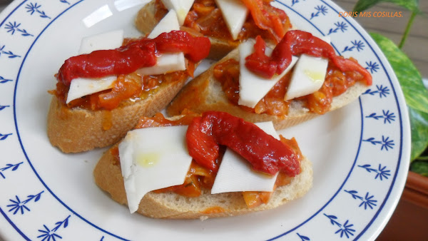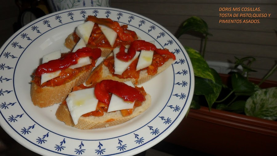 Cortamos unas rebanadas de pan rustico o el que mas nos guste un poco sesgadas, tostamos ligeramente, cubrimos con el pisto manchego, tiras de queso de oveja fresco o el que mas nos guste, unas tiras de pimientos rojos, un chorrito de aceite de oliva virgen extra y una pizca de sal.