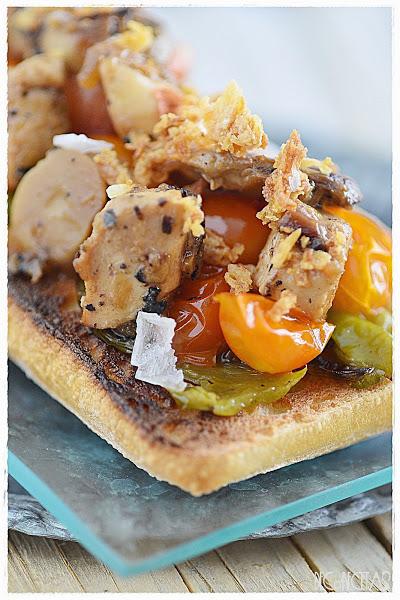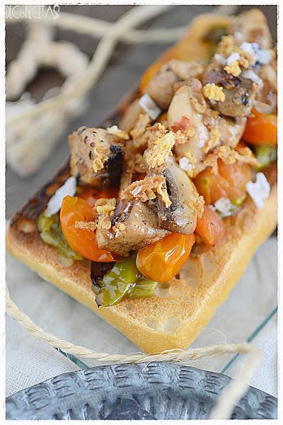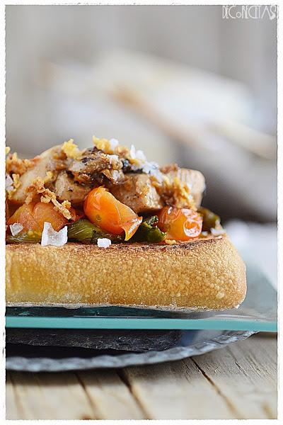 Para montar la tosta, primero los pimientos en tiras, después los tomates, la mezcla de pollo y champiñones, y como último toque cebolla frita y escamas de sal.