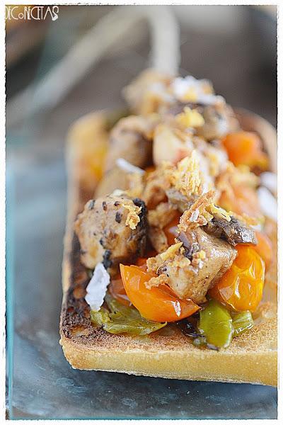 No hay nada que me guste más que una tortilla de patatas con pimientos. Y de unos cuantos pimientos que sobraron, me hice estas tostas.
