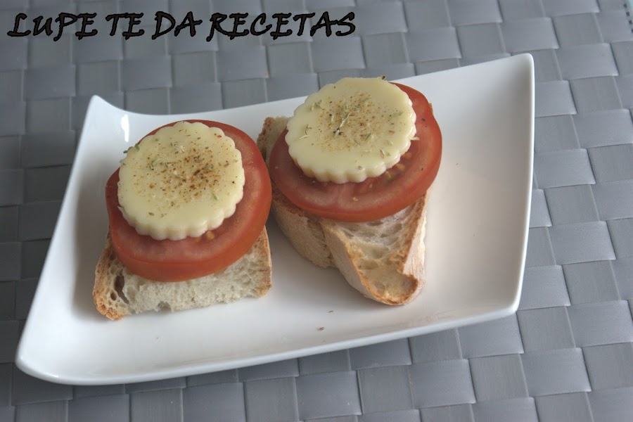Montar: Sobre cada rebanada echar un chorrito de aceite, poner encima el tomate, después el queso y salpicar con ajo, un poco de las 3 pimientas y por último orégano. Se puede salpicar de otro chorrito de aceite si se quiere.