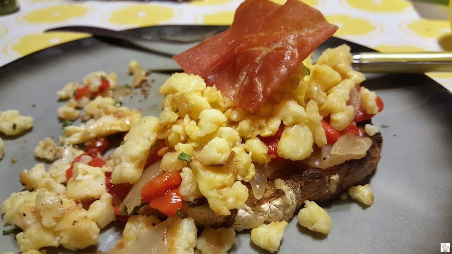 Tostamos nuestra rebanada de pan y la aliñamos con un buen chorretón de aceite de oliva. Mientras tanto, habremos calentado el pimiento y la cebolla y después de rociarlos con su jugo y otro poco de aceite, los colocamos estrategicamente encima de nuestra tostada. Acabamos de montarla con la "tortilla de patatas", un poco de cebollino picado y jamón serrano crujiente.
