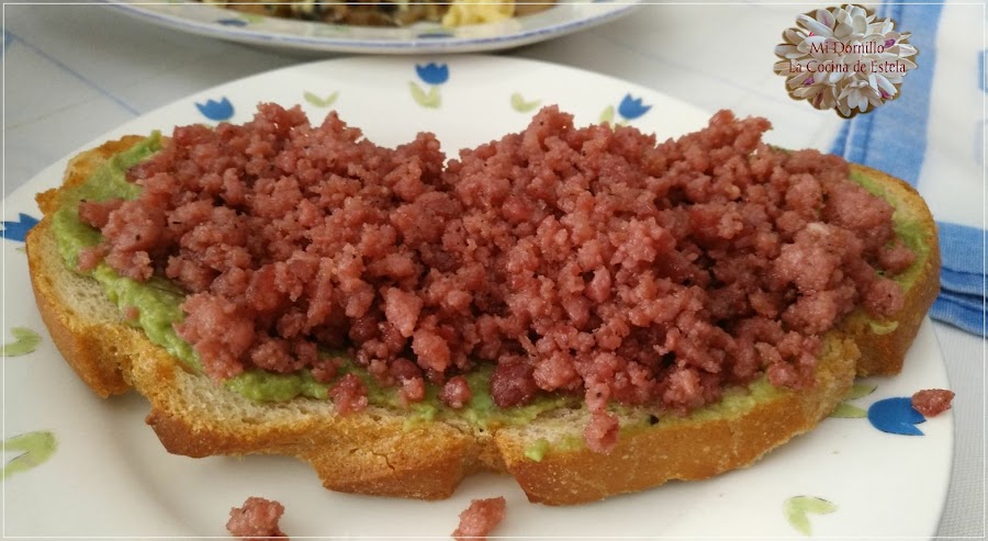 Tostamos mientras el pan , y untamos con el guacamole poniendo encima la carne de salchichón templada.