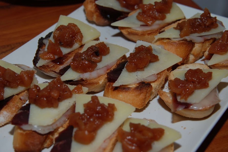 Tostas dejamón de pato, queso y chutney de pera