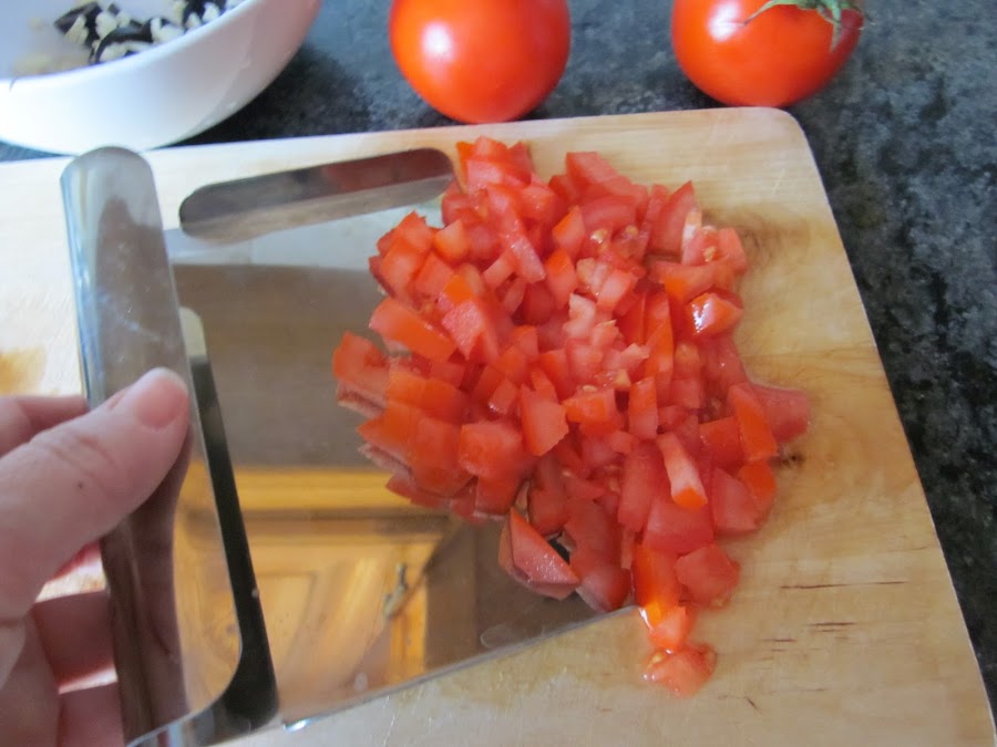Picamos el tomate,con el ajo,la albahaca y las aceitunas negras,salamos y rociamos con un buen aceite de oliva.