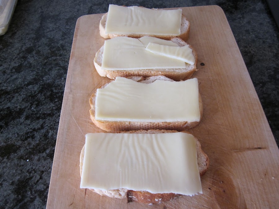 Ponemos en las rebanadas de pan,el queso, y metemos al horno,el pan se tuesta y el queso se derrite.