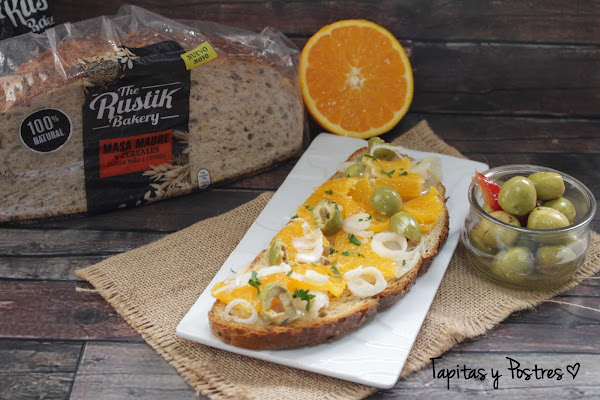 Hace unas semanas me presenté a un concurso de tostas patrocinado por Canal Cocina y el pan The Rustik Bakery. Es un pan que lleva poco tiempo en el mercado y que se caracteriza por estar hecho con masa madre. El caso es que me animé y preparé esta tosta a la que denominé Tosta Malagueña, porque lleva los mismos ingredientes que nuestra ensalada de naranjas y bacalao (aunque creo que no es exclusiva de Málaga jeje).