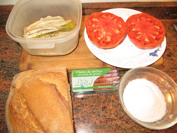 Esta es una tosta que preparan en mucho bares españoles y que está para chuparse los dedos. Primero cortamos el pan en rebanadas y las ponemos a tostar en una sartén o tostadora. Una vez que están doradas, untamos el diente de ajo y exprimimos el tomate natural por encima, ahora que hay tomates del huerto mucho mejor. Echamos un pelín de sal, pero no os paséis que la anchoa ya es muy salada.