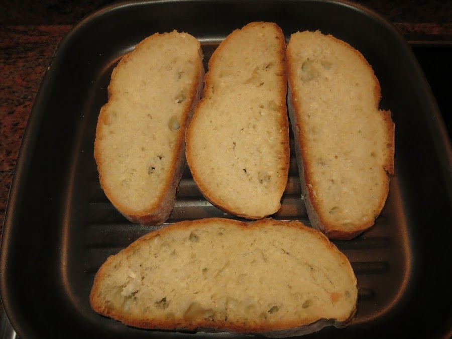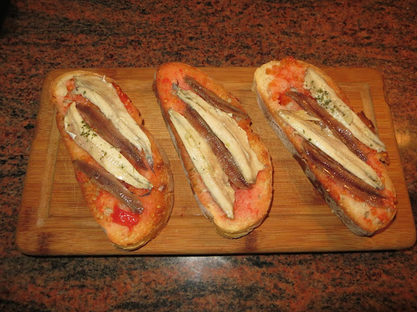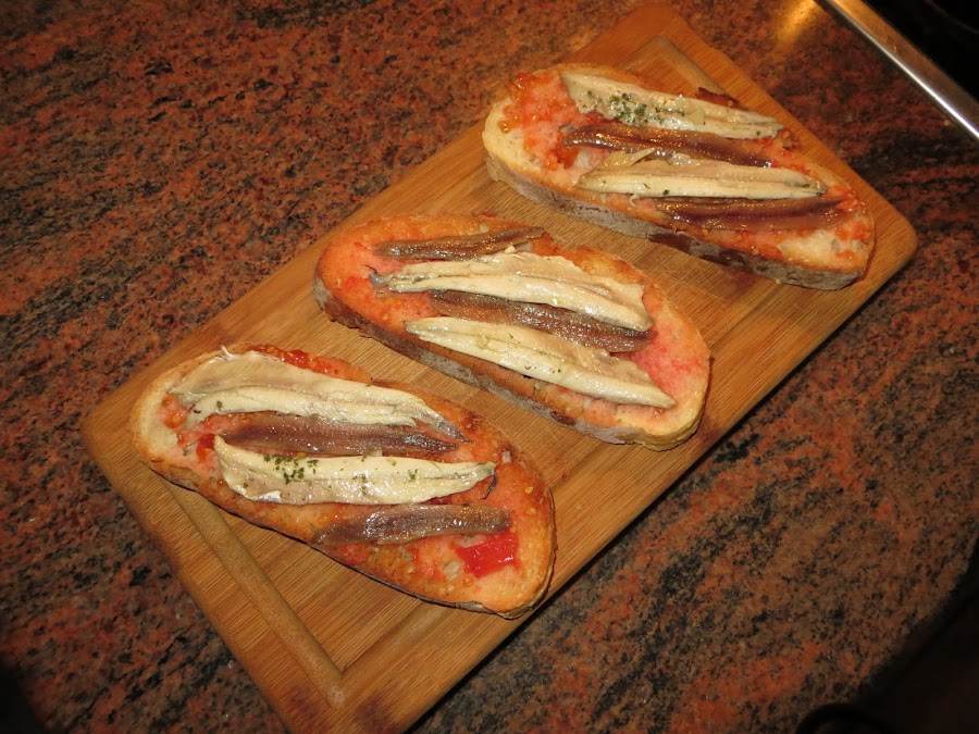 Ahora sólo queda poner los boquerones y las anchoas encima del pan. Normalmente hay un boquerón y anchos por rebanada, pero como a mí me salieron las rebanadas grandes decidí poner dos en cada una de ellas. Echamos un chorro de aceite de oliva por encima y ya están listas para comer.