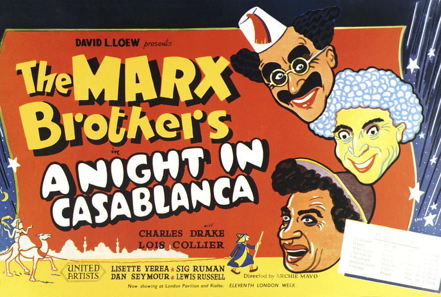 "Una noche en Casablanca" aprovechó el tirón de "Casablanca" (rodada 5 años antes) y es el colofón de una trayectoria perfecta. Aquí se reúnen los tres hermanos con toda su ristra de sellos de identidad: humor sarcástico ("Ya sé que la botella está vacía, es champán seco"), gags visuales (memorable la escena del equipaje), pareja de enamorados a los que ayudan a derrotar al villano de turno - el maravilloso Sig Ruman, su clásico enemigo - interludios musicales de piano y arpa, y sobre todo mucho caos alrededor de sus actos. En su locura reside la magia de su talento.