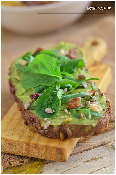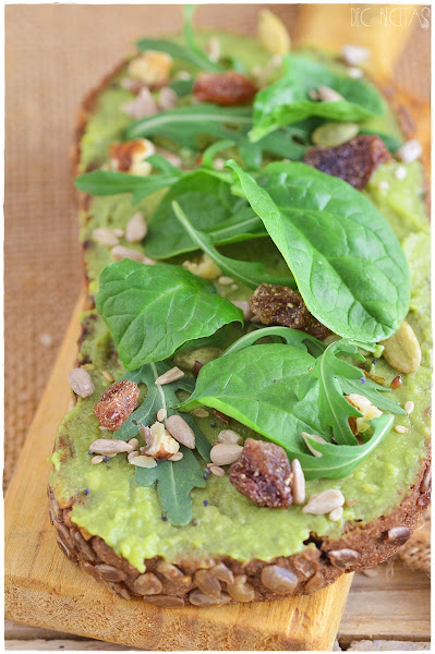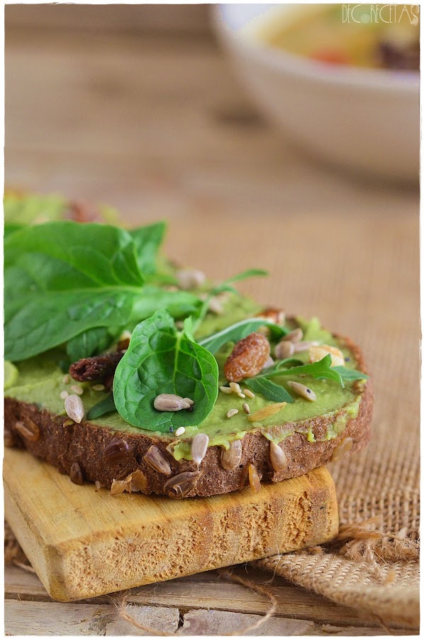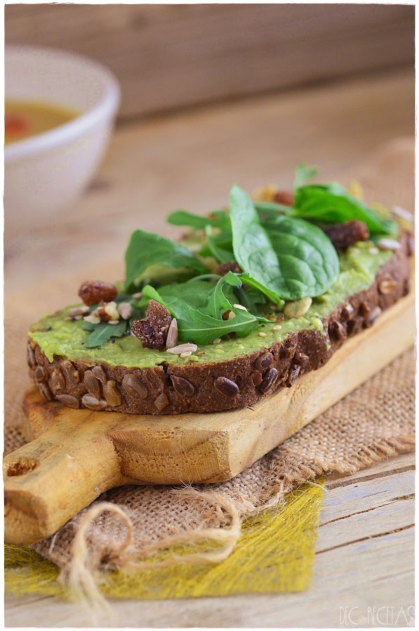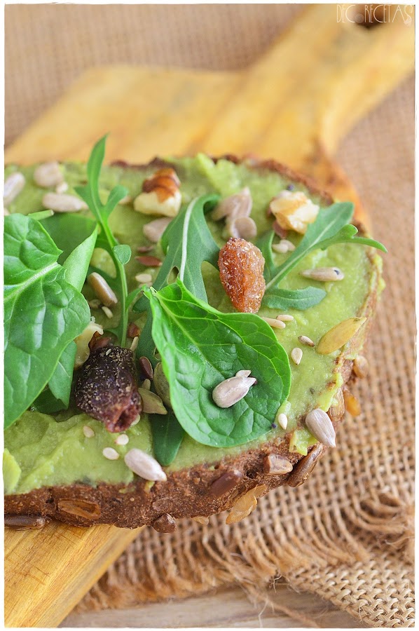 Tostamos la rebanada de pan, huntamos con guacamole al gusto y encima disponemos rúcula, espinacas, semillas varías, frutos secos ( en este caso nueces) y pasas. Al final un poco de lo que tengáis en casa.