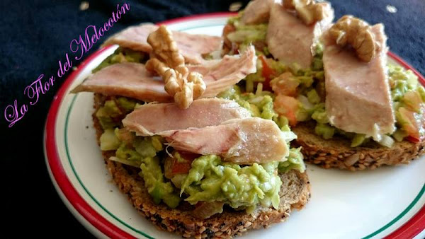 Esparcimos por encima de las tostadas, ponemos el atún por encima y acabamos con una nuez partida en dos.