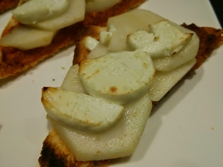 - Tostar el pan, untar la sobrasada, cortar el pan como queramos y poner sobre la sobrasada la pera escurrida y un trocito de queso de cabra. Gratinar en el horno hasta que se dore.