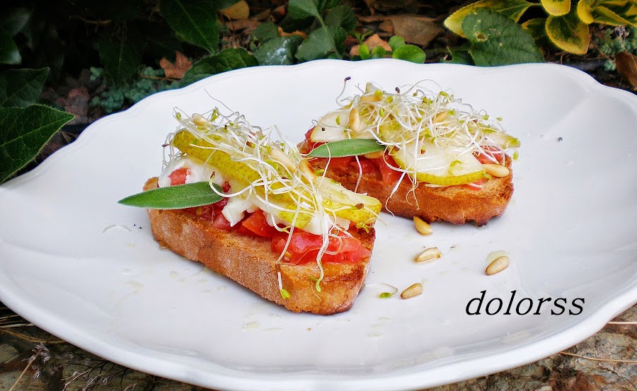 Montar la tostada: sobre el pan poner daditos de tomate, rociar con aceite, encima trozos de queso de cabra, un par de láminas de pera, brotes de alfalfa y terminar con piñones tostados.