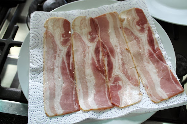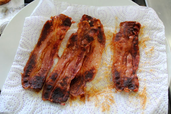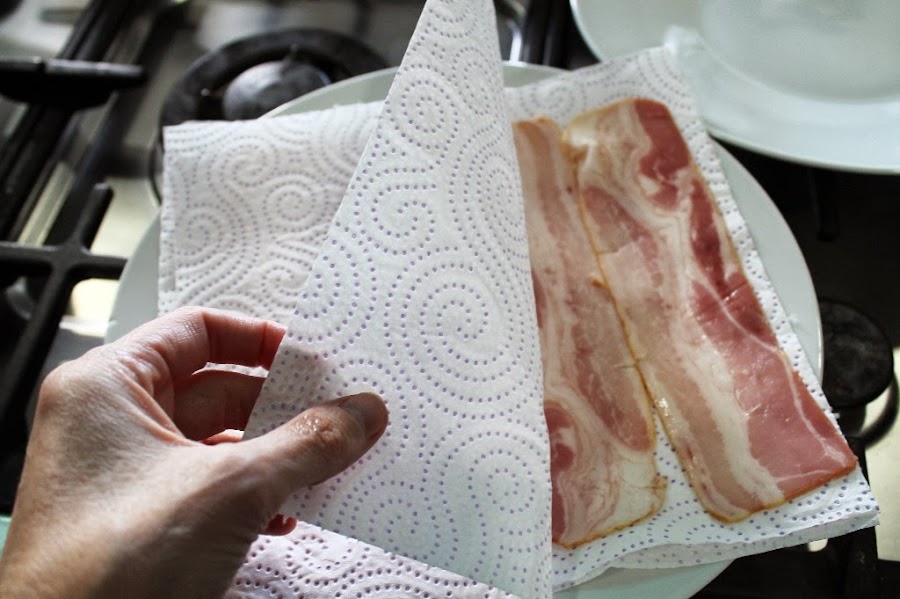 Mientras tanta ponemos el bacon en un plato con papel de cocina absorbente y otro plato encima para que nos queden planos y los ponemos al microondas durante unos 7-8 minutos dependiendo del microondas que tengáis. Una vez hecho sacarlo con mucho cuidado de no quemaros y reservar.
