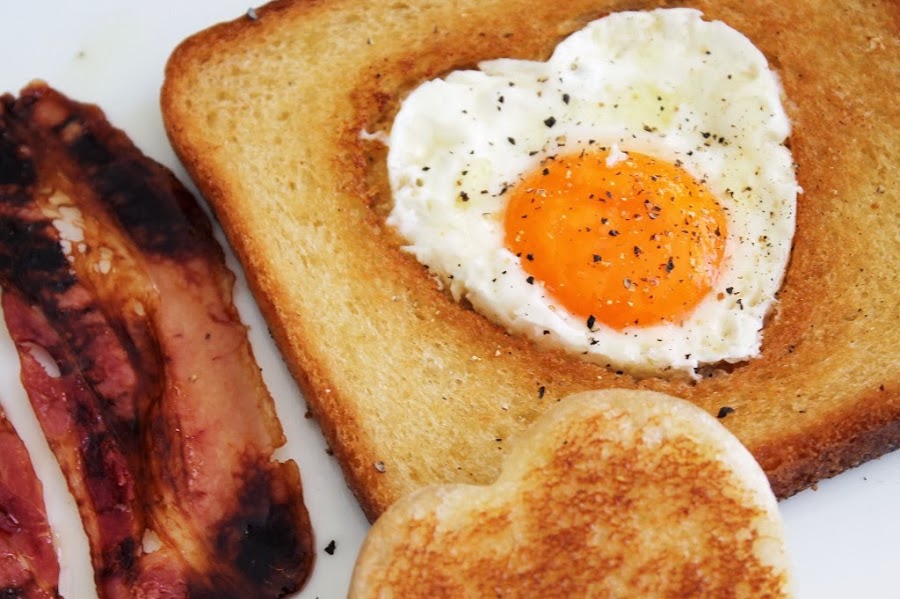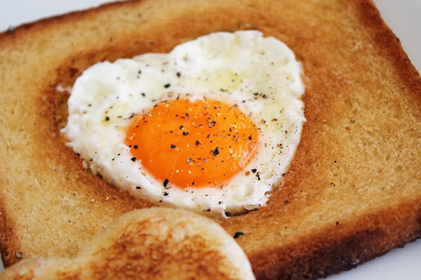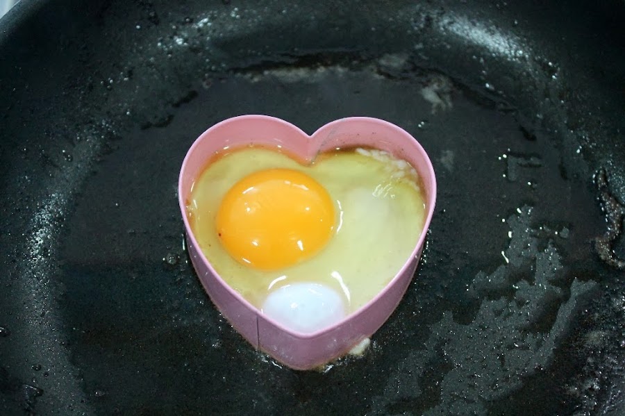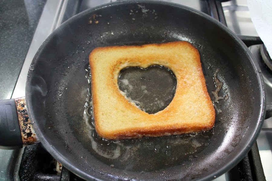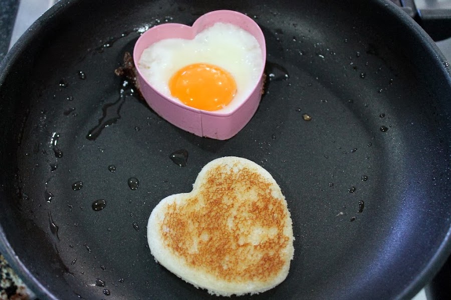 En otra sartén o en la misma pero limpia ponemos un poco mas de mantequilla y el molde en forma de corazón, le cascamos un huevo dentro y a fuego flojo dejamos que se vaya cuajando, a un lado ponemos el trozo de corazón que le habíamos quitado a la tostada para que también se dore.