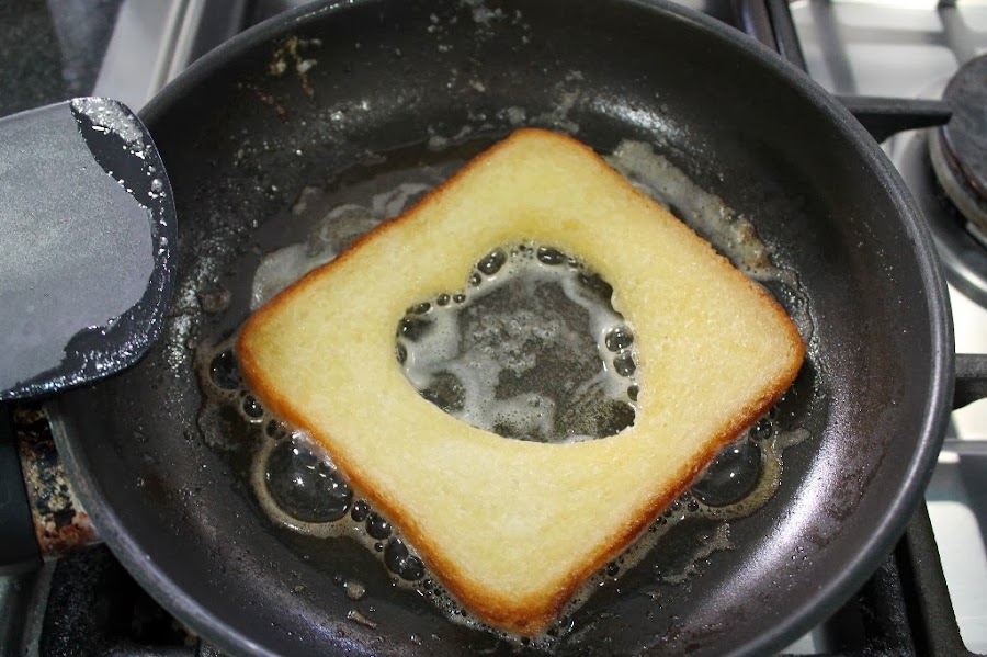 Ponemos al fuego una sartén con mantequilla y un poco de aceite y ponemos la tostada para que se dore por ambos lados, cuando le deis la vuelta ir con cuidado porque al tener el centro agujereado se puede romper fácilmente.