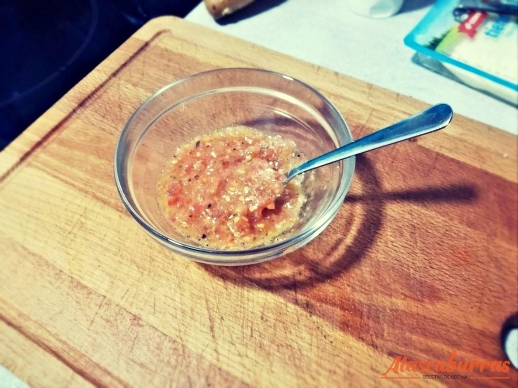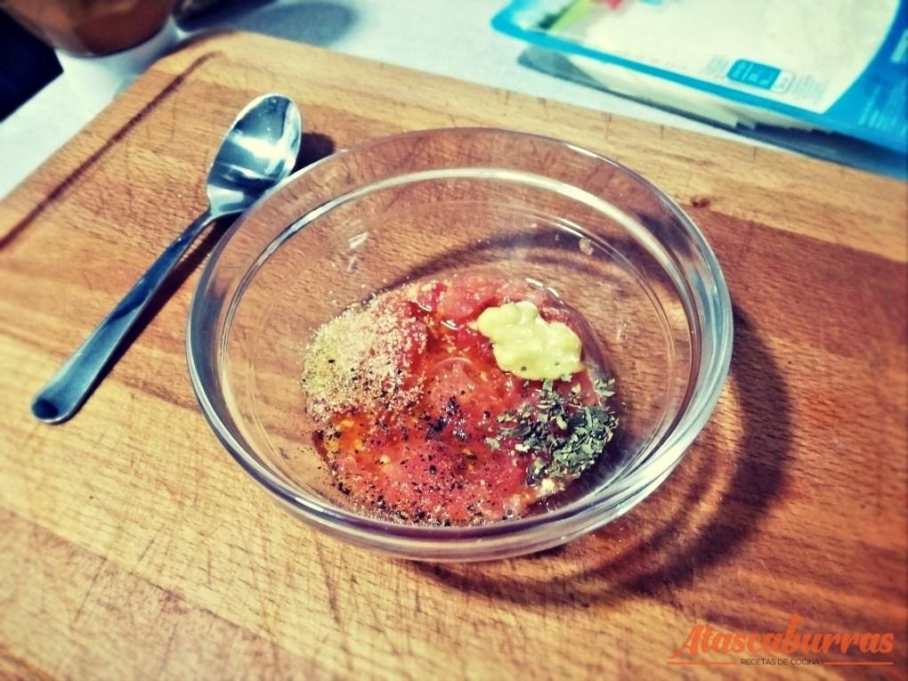 Mezclamos el tomate rallado con una cucharada de mostaza, pimienta, ajo en polvo, albahaca y sal