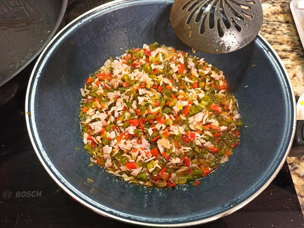 Añadir el jamón york, dejar unos segundos con el sofrito, quitar del fuego y reservar.