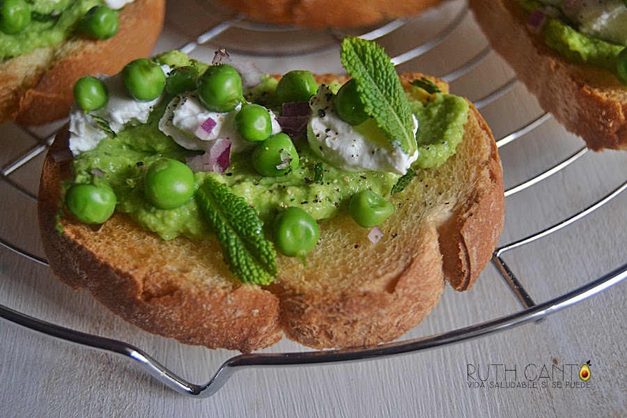 Con las tostadas de pan ya frías echar la crema, poner un poco de queso de cabra, unos guisantes, unas hojas de menta, la pimienta y un poquito de cebolla roja troceada y a disfrutar de esta deliciosa receta saludable.