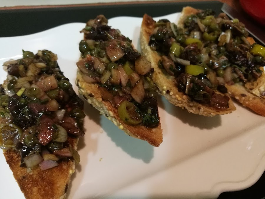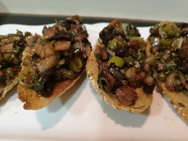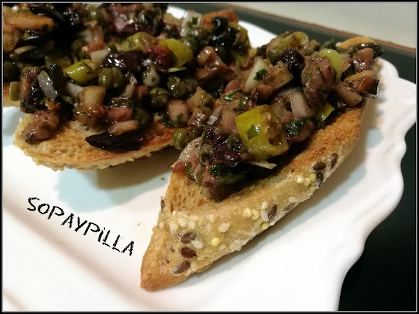- Picar cebollas, guindilla (quitando las semillas), aceitunas (quitando el hueso), alcaparras, anchoas y perejil, bien finito.