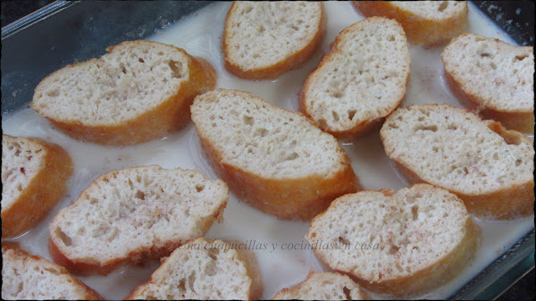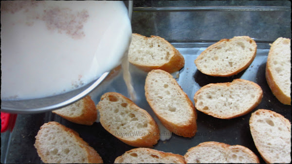 Pasado los 10 minutos, retirar la rama de canela y verter la leche en las tostadas que previamente las hemos puesto en una fuente. Dejar reposar hasta que absorvan toda la leche.