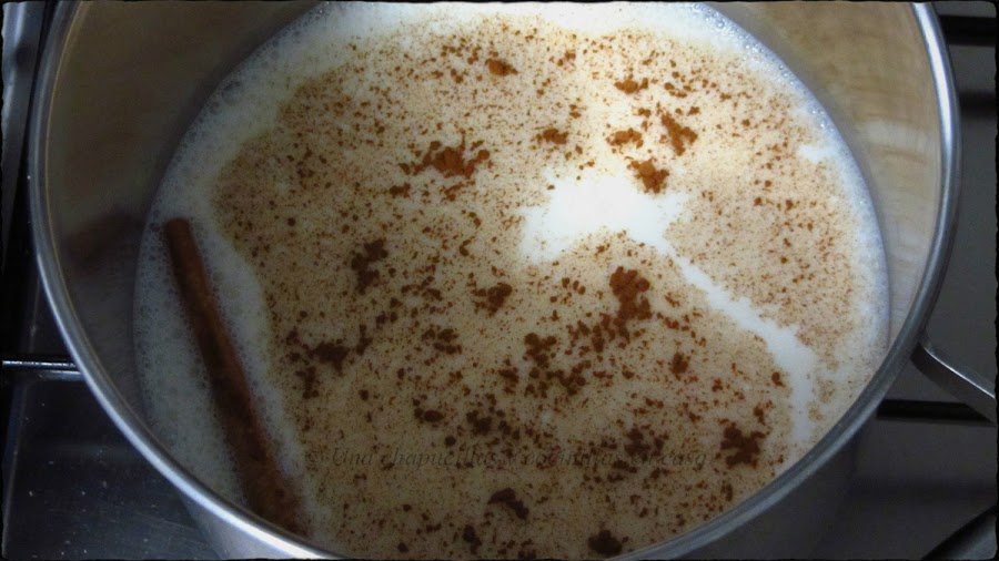 Poner a calentar la leche junto con la canela en rama, el azúcar y yo siempre le espolvoreo un poco de canela en polvo, esto ultimo es totalmente opcional. Dejar que llegue a hervir, bajar el calor al mínimo y que vaya borboteando poco a poco durante 10-12 minutos.