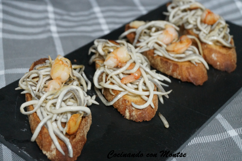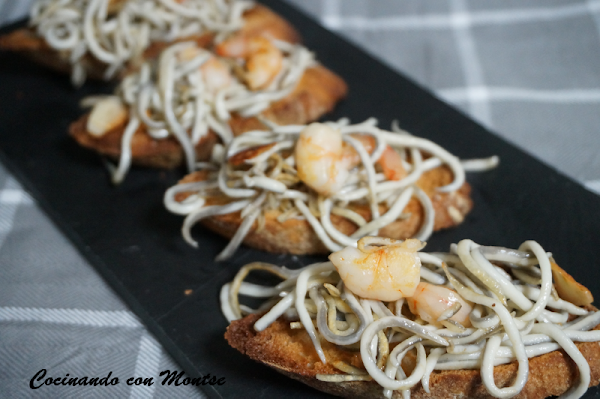Tostadas de angulas sucedáneas con gambas, un pincho ideal para preparar en estas fiestas, como entrante, como tapa o pincho. Es una delicia.