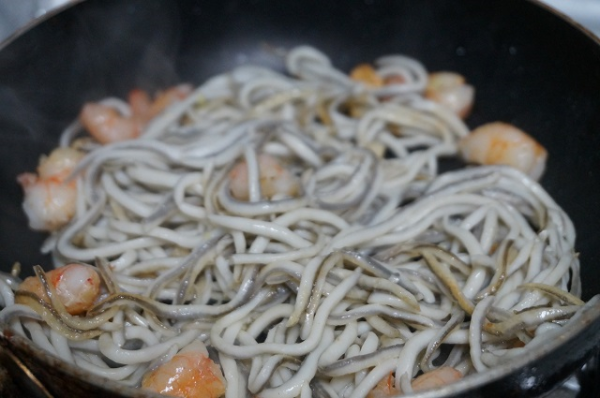 Cuando las gambas estén casi hechas añadimos las angulas sucedáneas y salteamos. Ponemos un poco de sal.