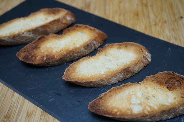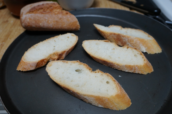 Mientras coge color las gambas, cortamos el pan en rodajas al bies, las ponemos en una bandeja de horno. Encendemos el horno lo ponemos a 180ºC calor arriba y abajo e introducimos la bandeja de pan.